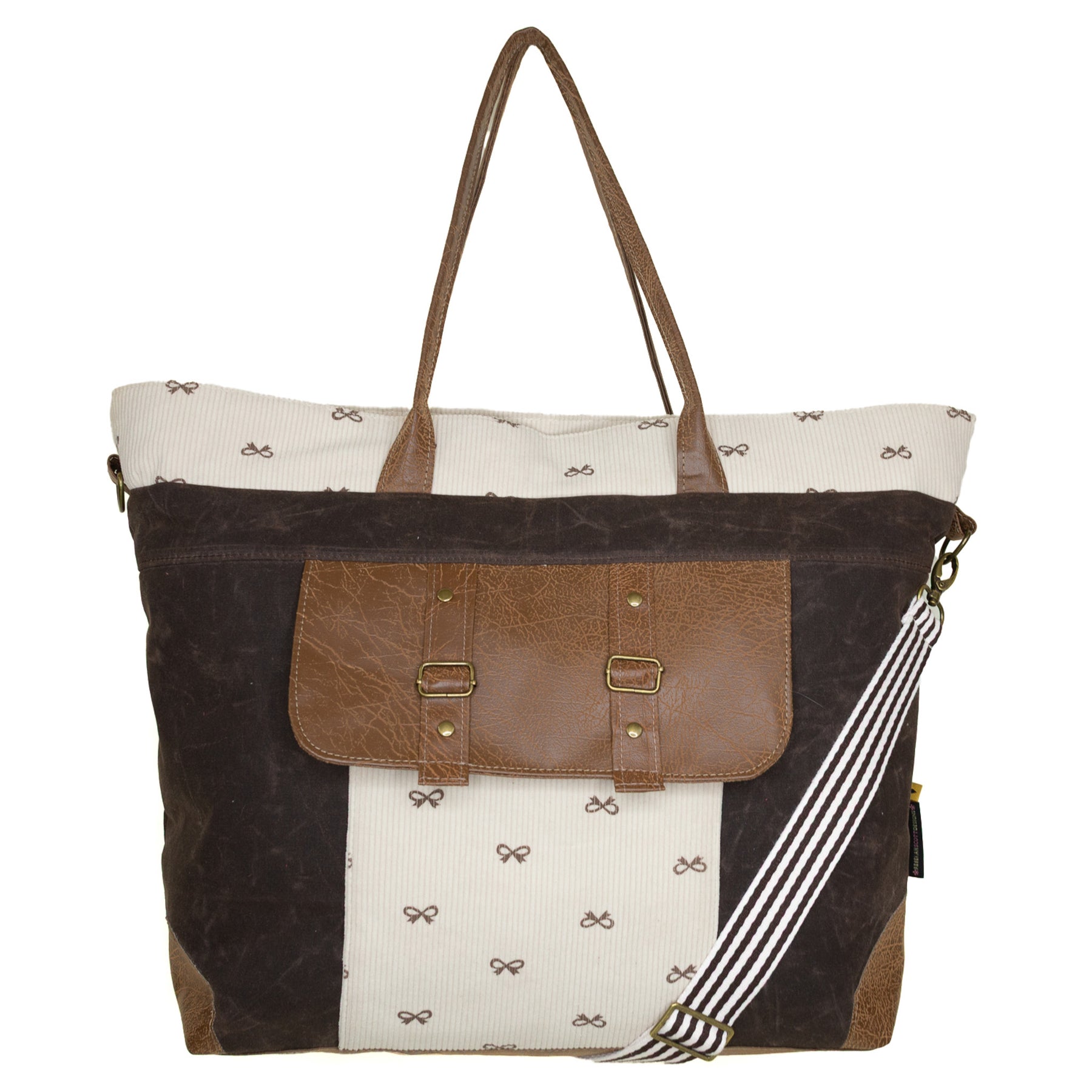• faux leather base, shoulder straps, adjustable crossbody strap, and detailing