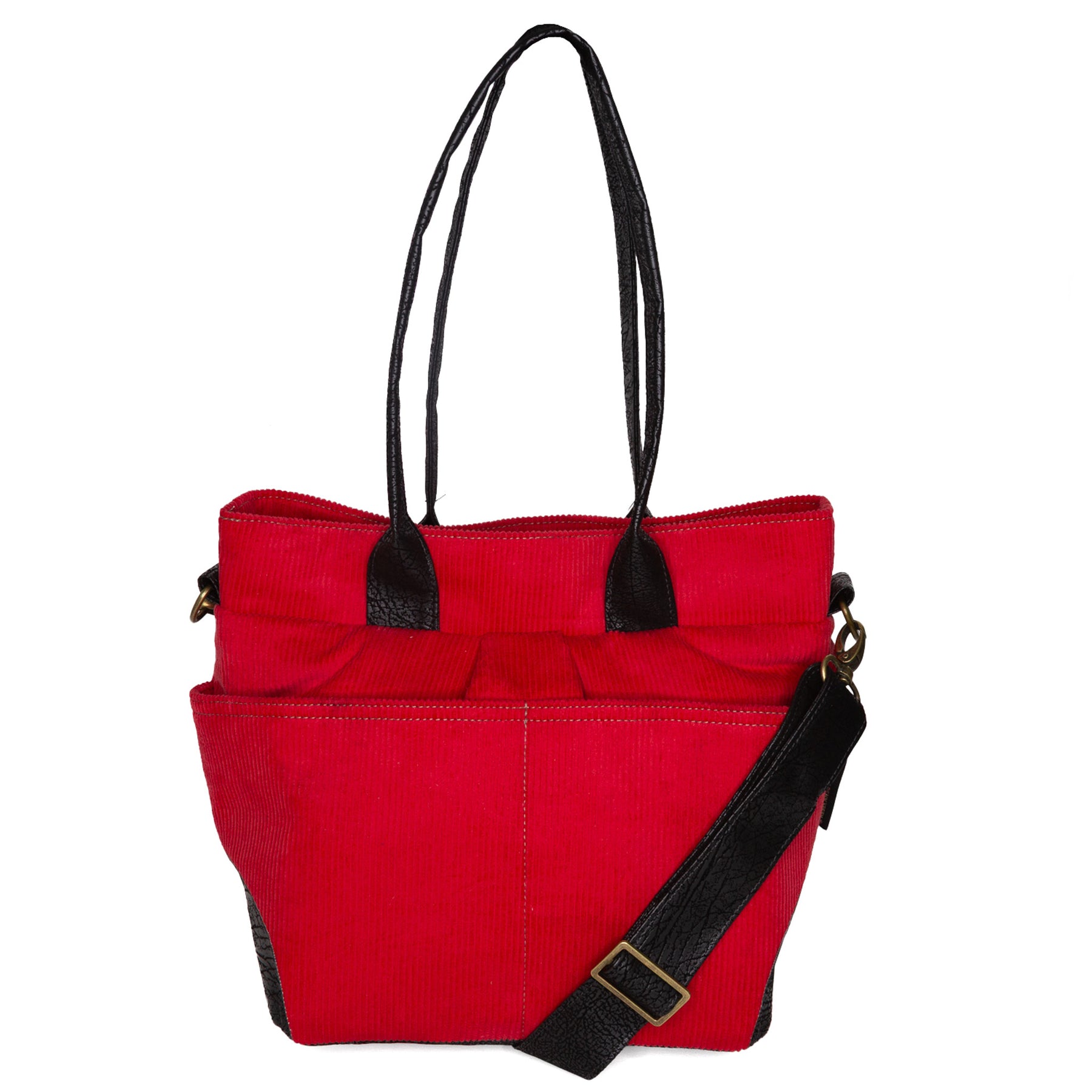 • faux leather base, shoulder straps, and adjustable crossbody strap