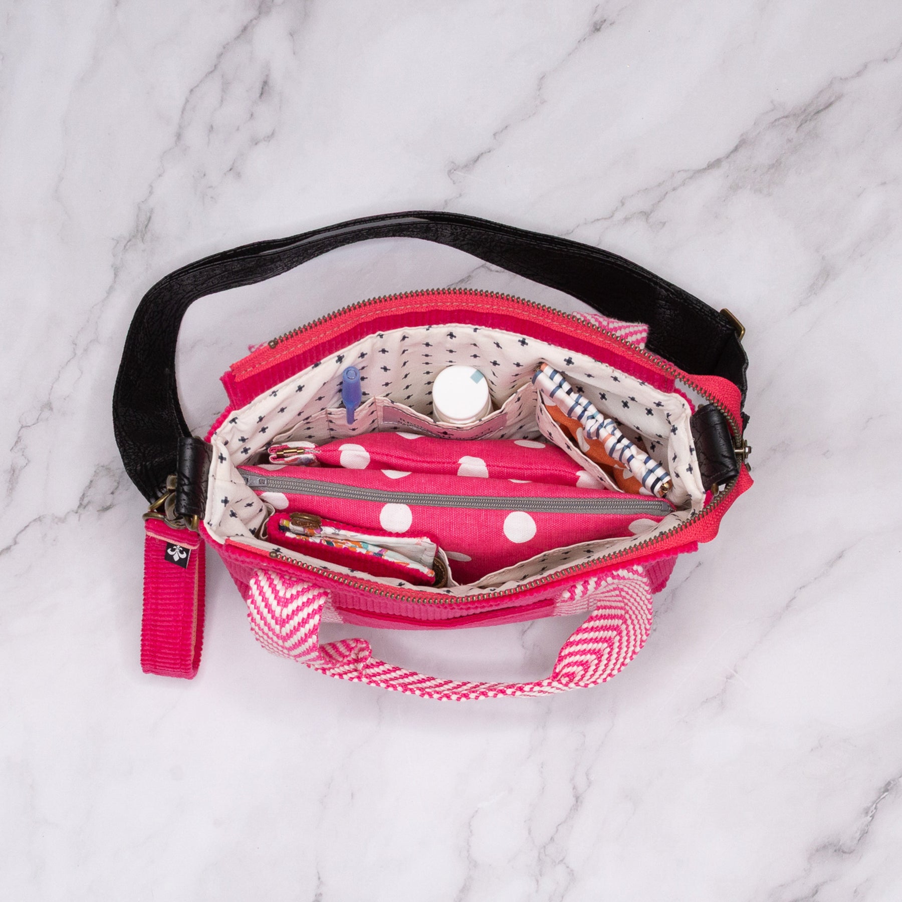 Mary is a small-sized everyday style purse! With a single adjustable strap, and adorable arm handles- she can be worn over the shoulder or lengthened to wear crossbody!
