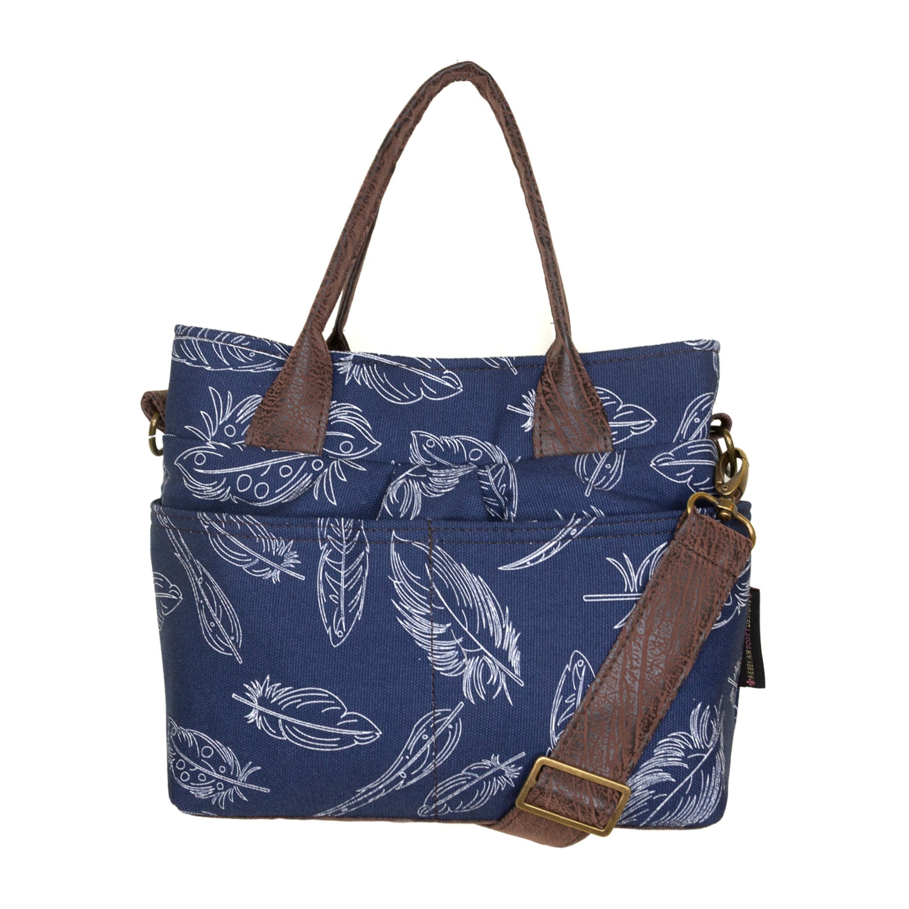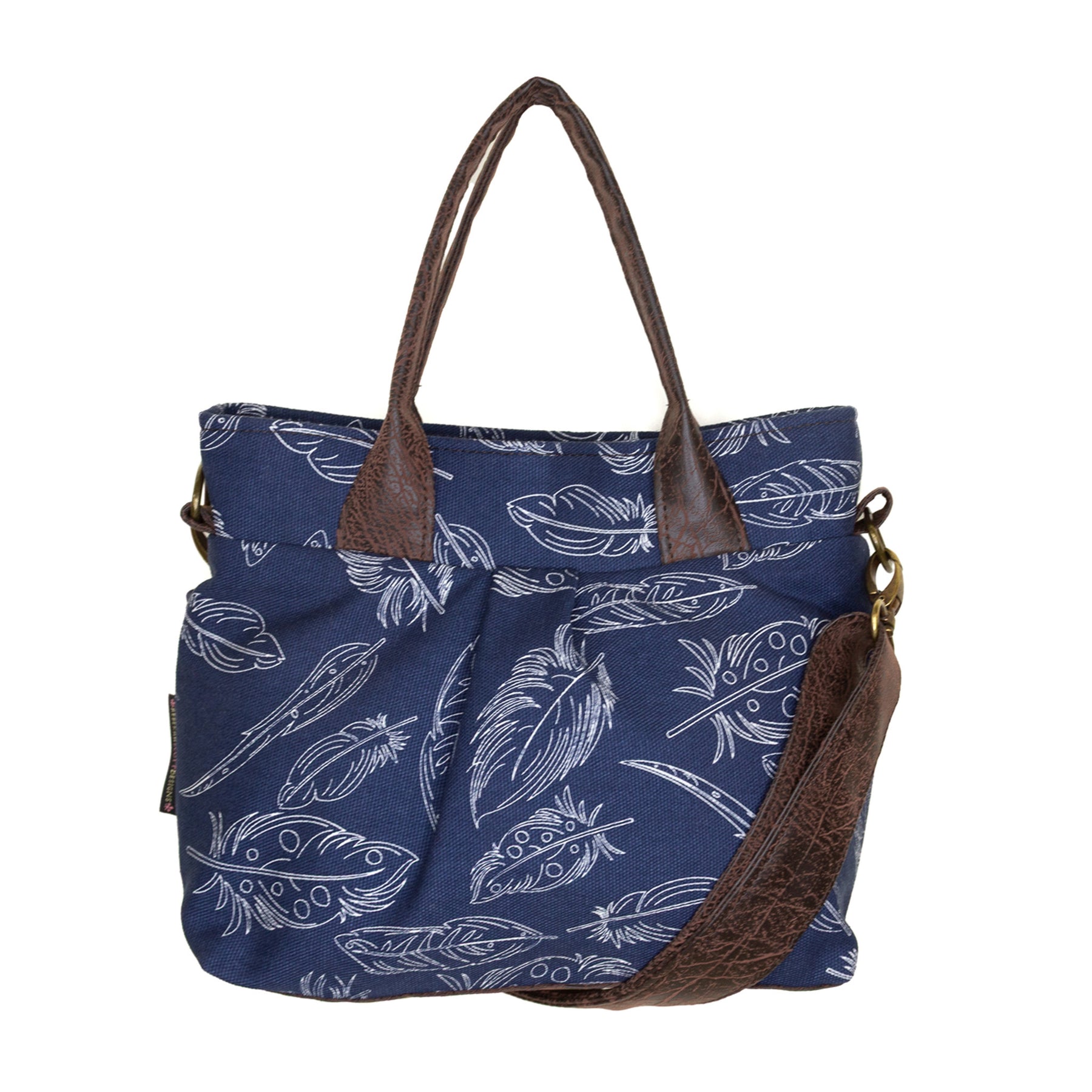 • faux leather base, handles, and adjustable crossbody strap