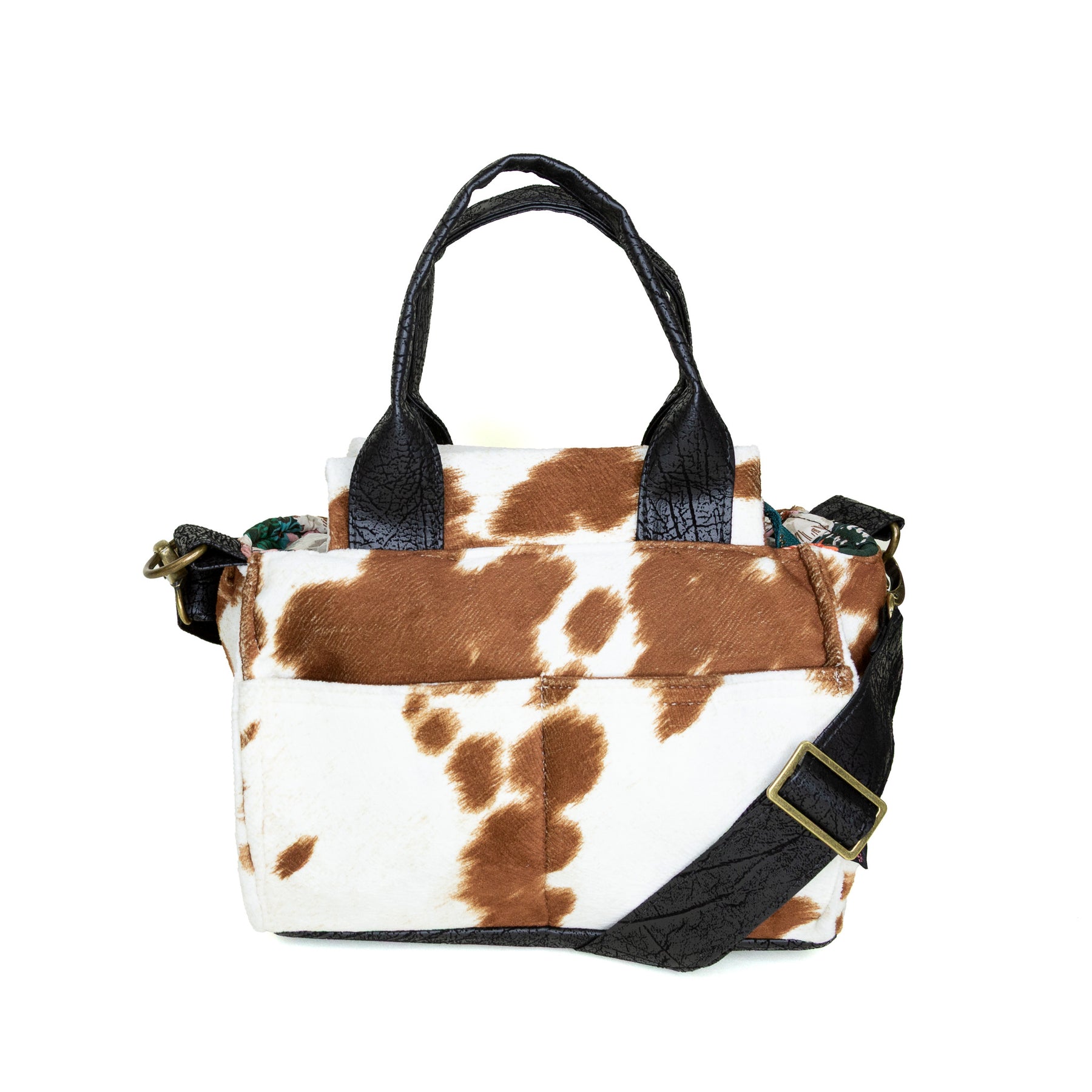 • faux leather base, short handles, and adjustable crossbody strap