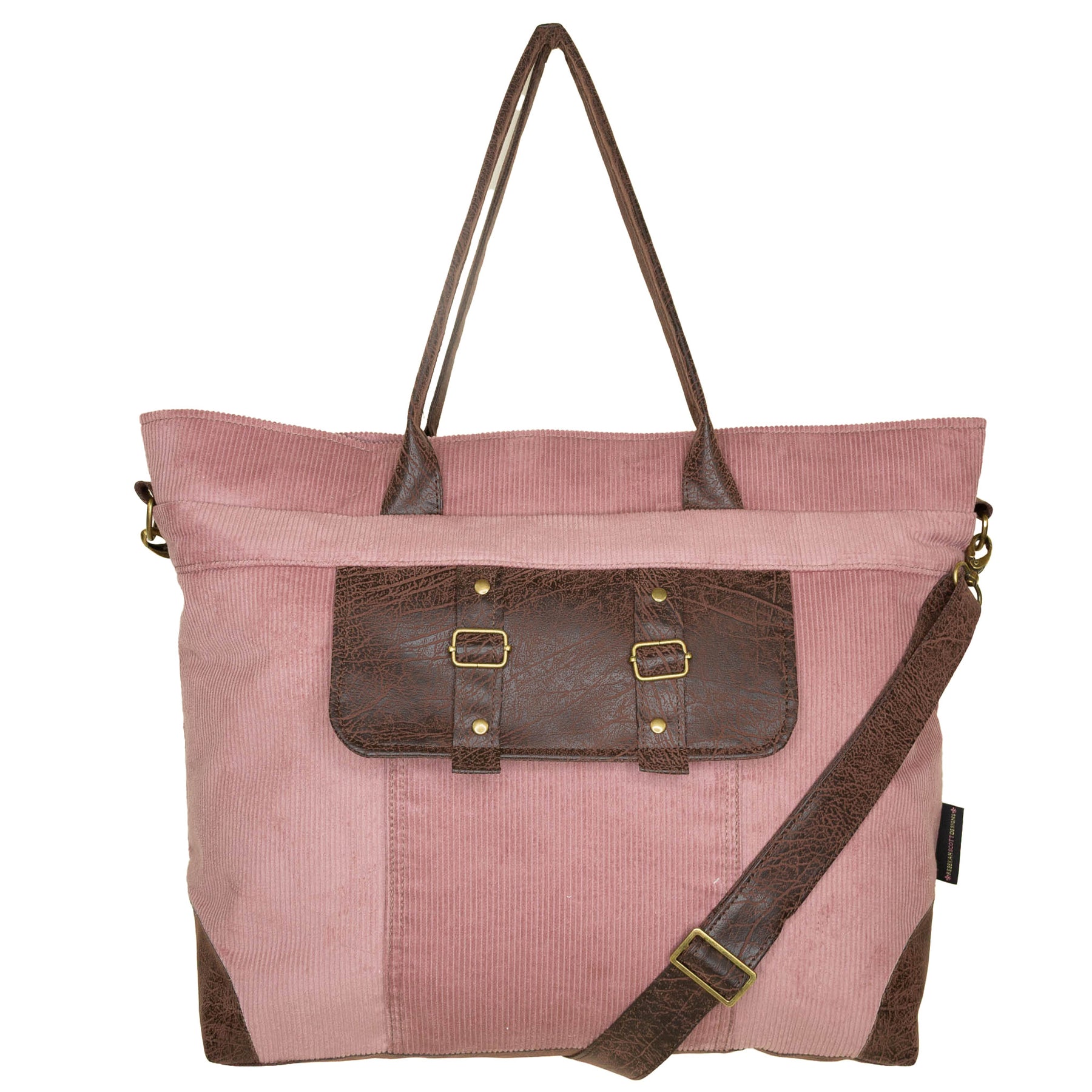 • faux leather base, shoulder straps, adjustable crossbody strap, and detailing