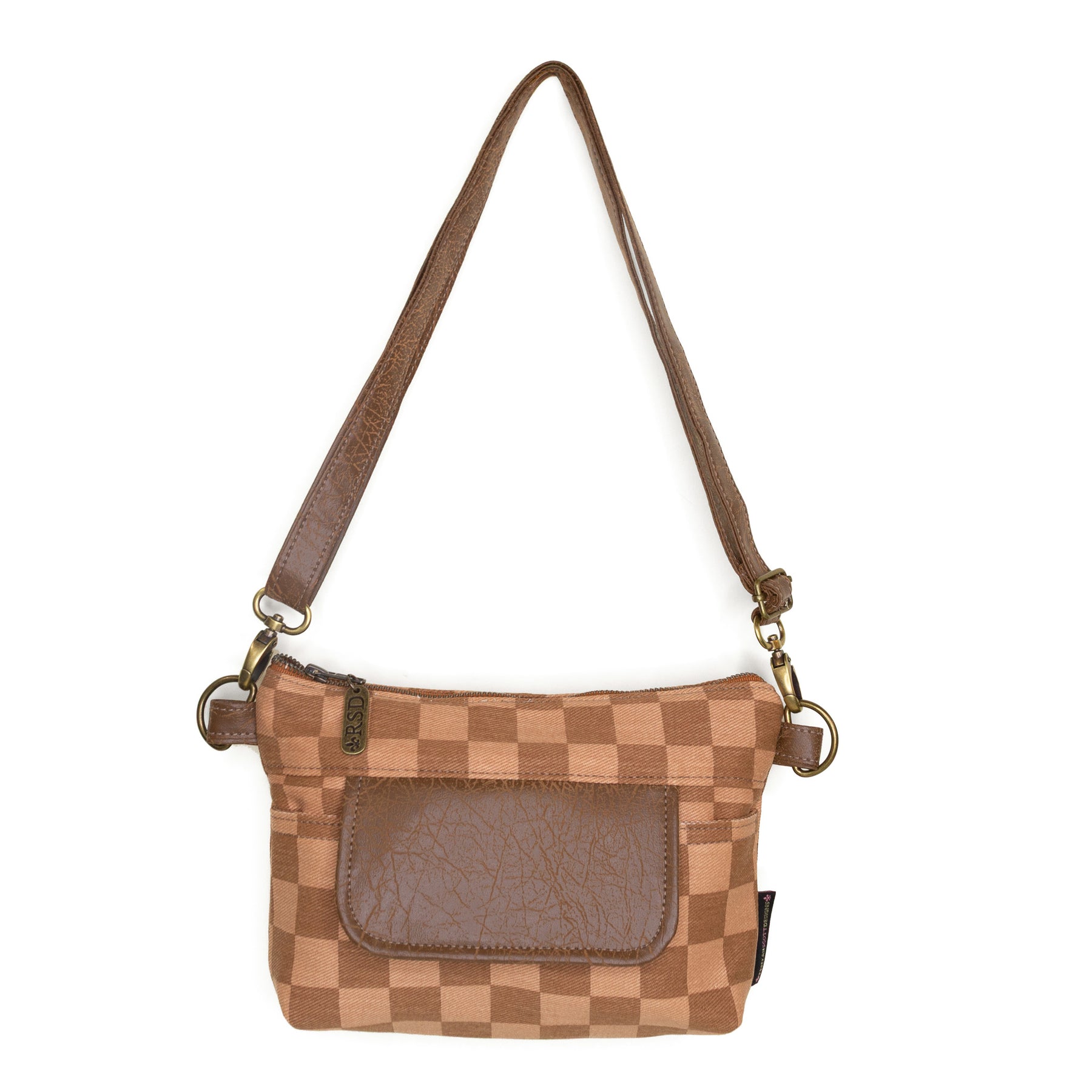 • Faux leather base, adjustable/removable skinny crossbody strap, and details